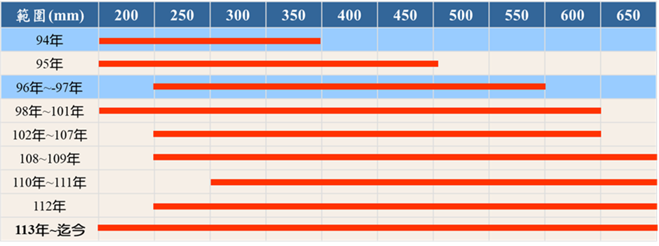 - 以 50mm 為 1 級距,設定土石流警戒基準範圍以 200mm 為下限 、650mm 為上限(共 10 個級距)。