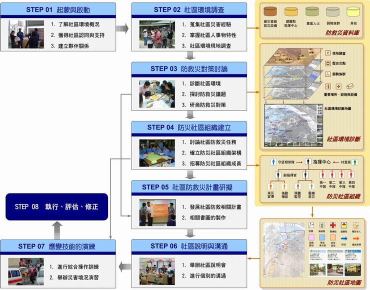 考量社區內可能發生的災害類型、檢核防救災物資,連結相關的地方行政單位與民間組織,針對社區較易受災影響所需的基本技能,進行防災演練,以強化社區應變能力。